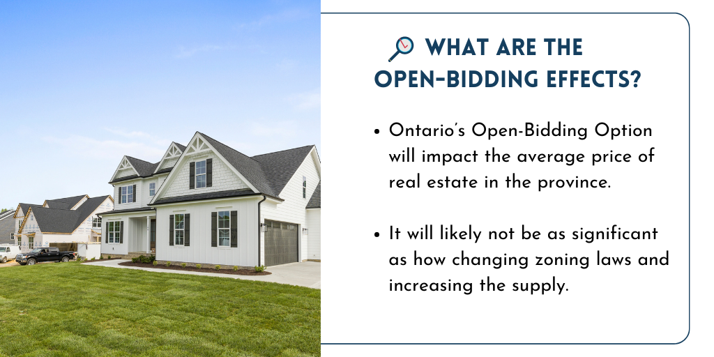 Perhaps Ontario’s Open-Bidding Option will impact the average price of real estate in the province. Still, if it does, it will likely not be as significant as how changing zoning laws and increasing supply can impact price. Whether you disagree or agree with the new rule, it probably depends on whether you believe sellers should have the option to engage in Open-Bidding, or whether Open-Bidding should be mandated for transparency.