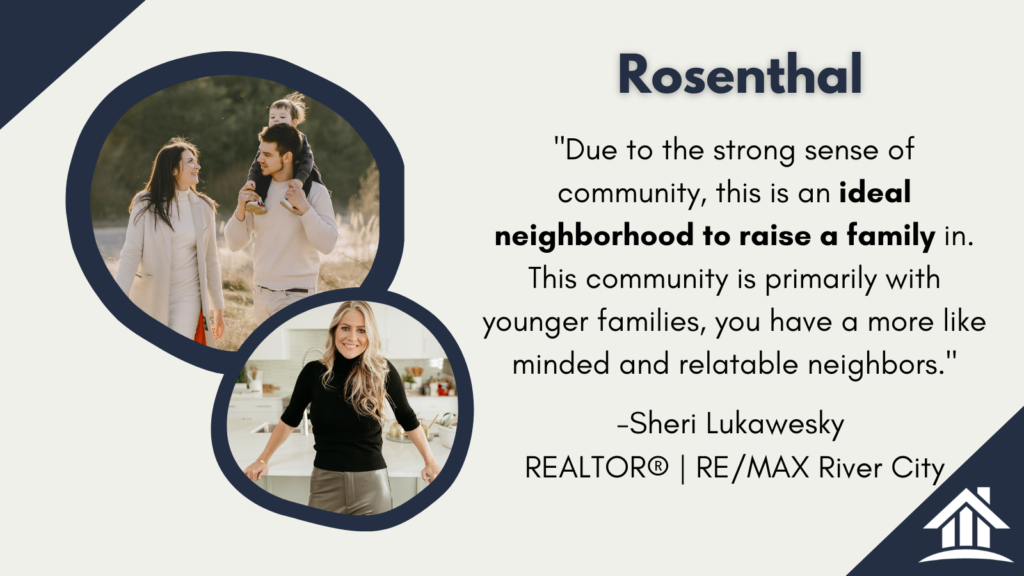 Rosenthal continues to attract young families due to the peaceful identity the community has. The local greenways offer over 5k worth of walking paths, with natural attractions around such as waterfalls, brooks, and a community garden. Plan an outing with your kids to the local splash park, playgrounds, skating rinks, and keep your eyes out for the upcoming recreational centre.